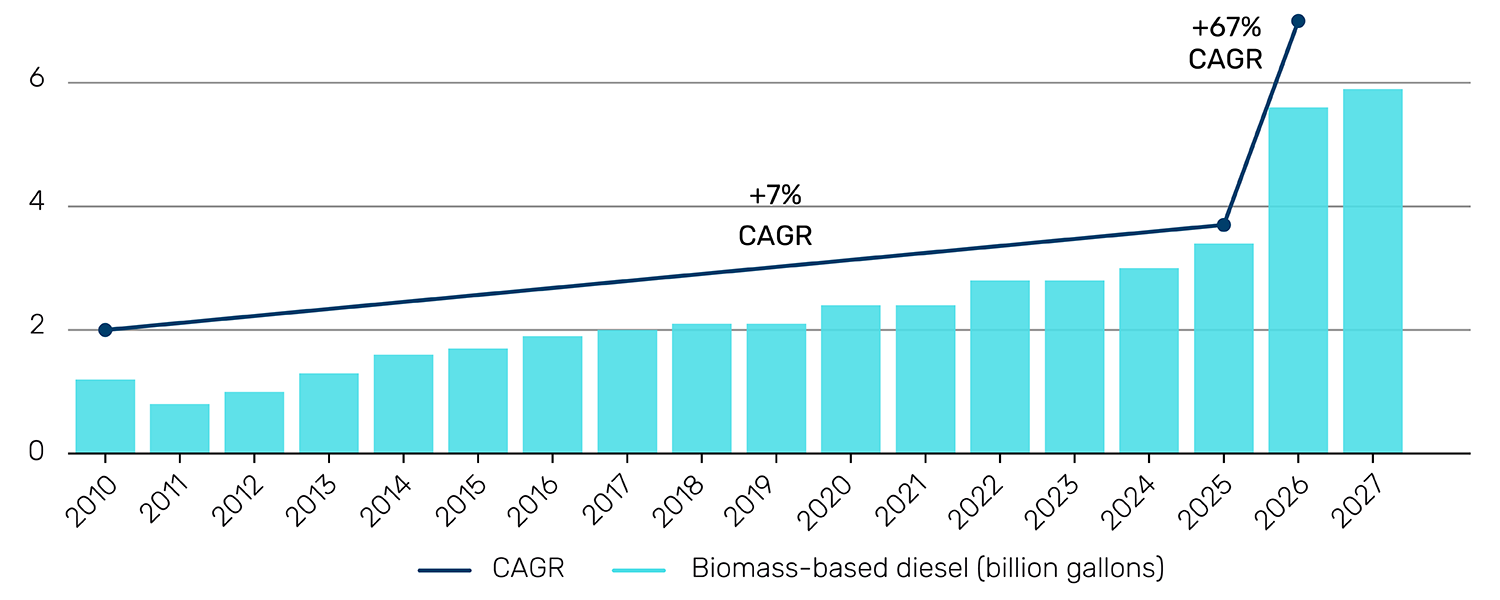 - An increase in biomass-based diesel production by 67%, requiring an additional 3.6 million tonnes of soybean oil. However, new crushing capacity coming online will provide only around 2.9 million tonnes, leaving a shortfall of approximately 700,000 tonnes