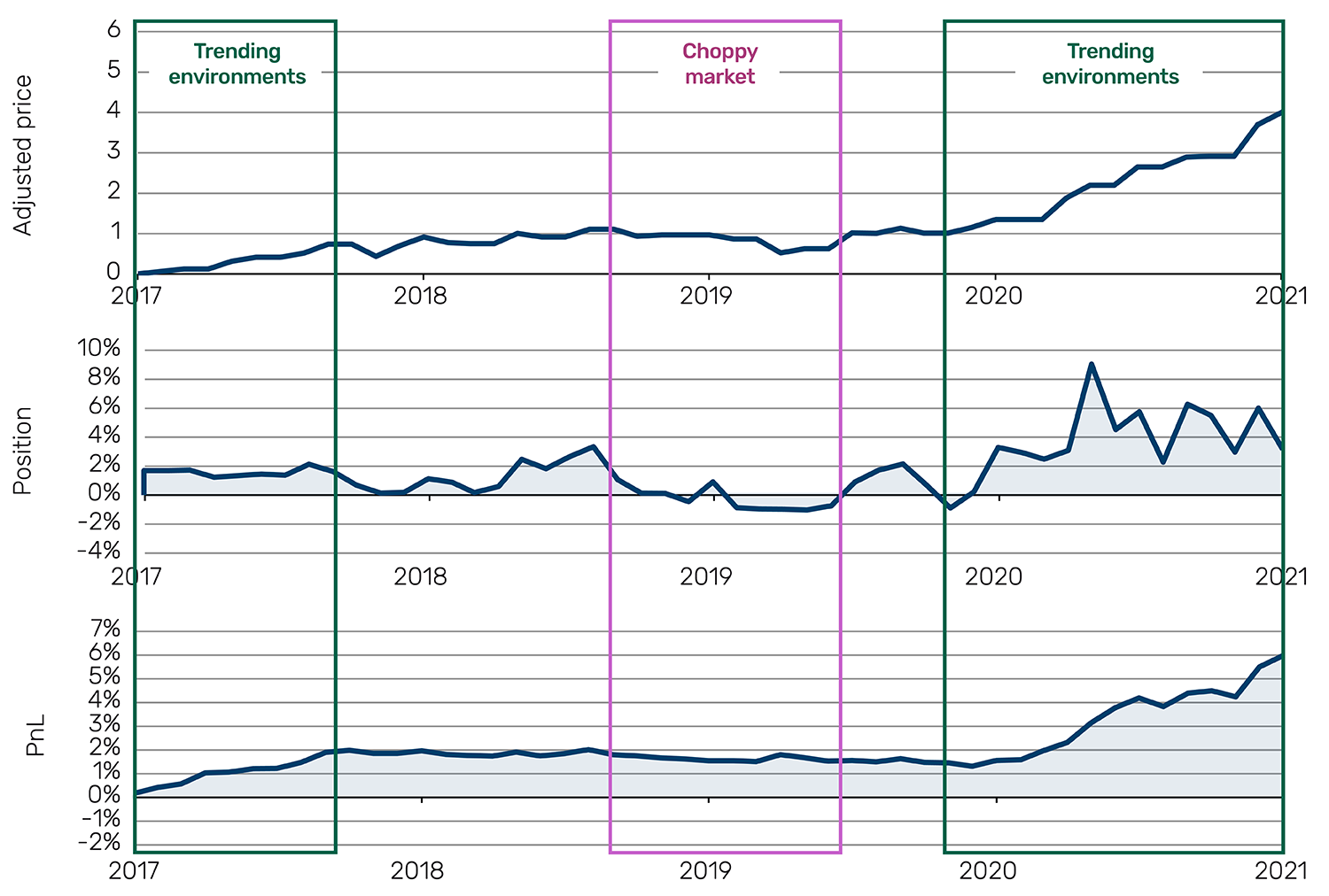 Trend-following strategies use a rules-based approach to identify trends across hundreds of markets, including commodities, aiming to capitalise on price persistence in either direction. Despite broad diversification, trend-following is “a buyer of stories” and gravitates toward compelling market narratives and scales exposure higher in markets showing strong trends while keeping positions minimal where trends remain weak.