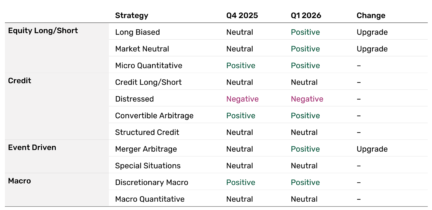 Figure 1 summarises our stance on different hedge-fund strategies for Q1 2026.