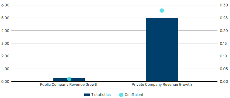 We conducted a predictive regression to forecast future business segment level revenue growth for public companies in the US, using both past realised private and public revenue growth as explanatory variables. When forecasting future public revenue growth, both past public and private revenue growth yield statistically significant positive T-statistics (Figure 4).3 Therefore, both types of revenues are valuable in predicting future public revenue growth. The higher T-statistics and coefficients derived from the past revenue growth of the public sector indicate a consistent trend in public company revenue growth. Thus, the significance of private sector data in predicting public growth validates our hypothesis of information flow from the private to the public market.