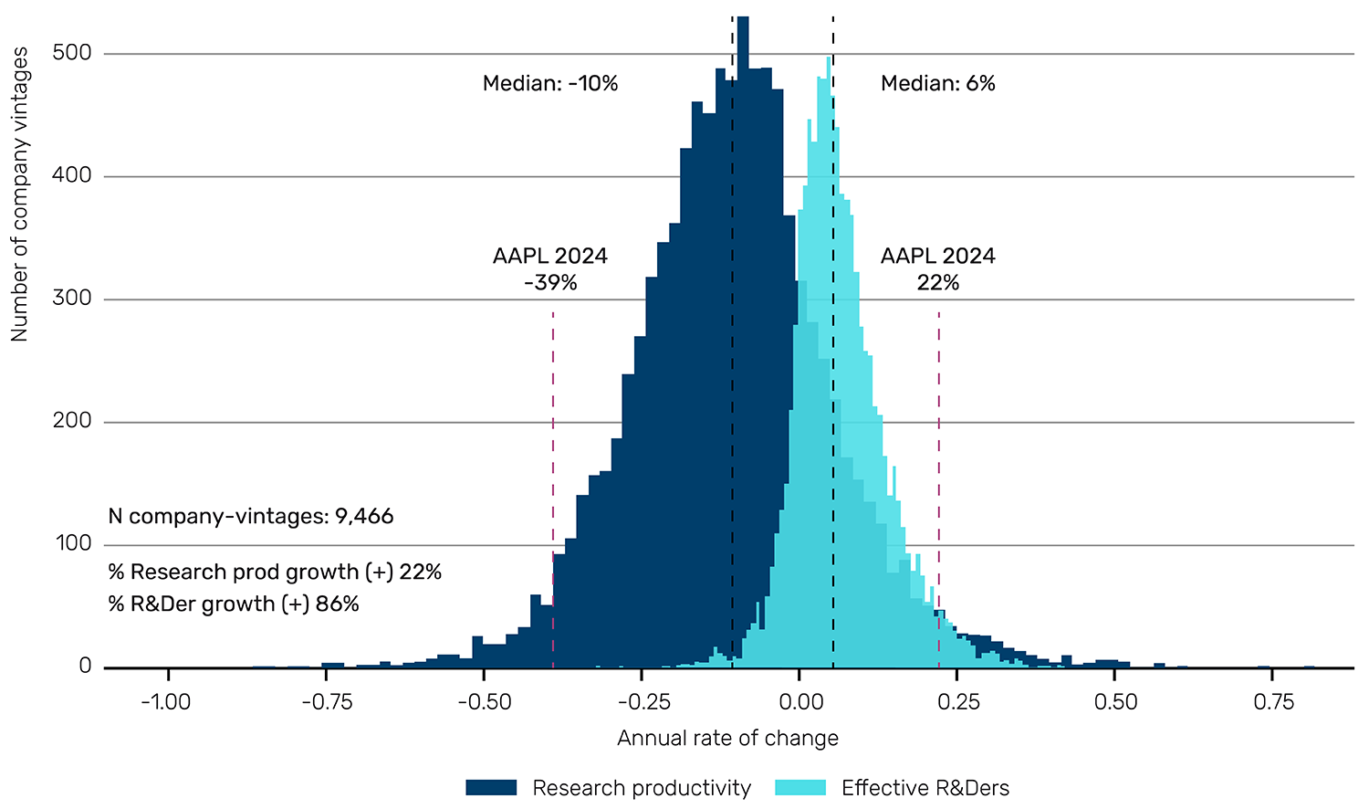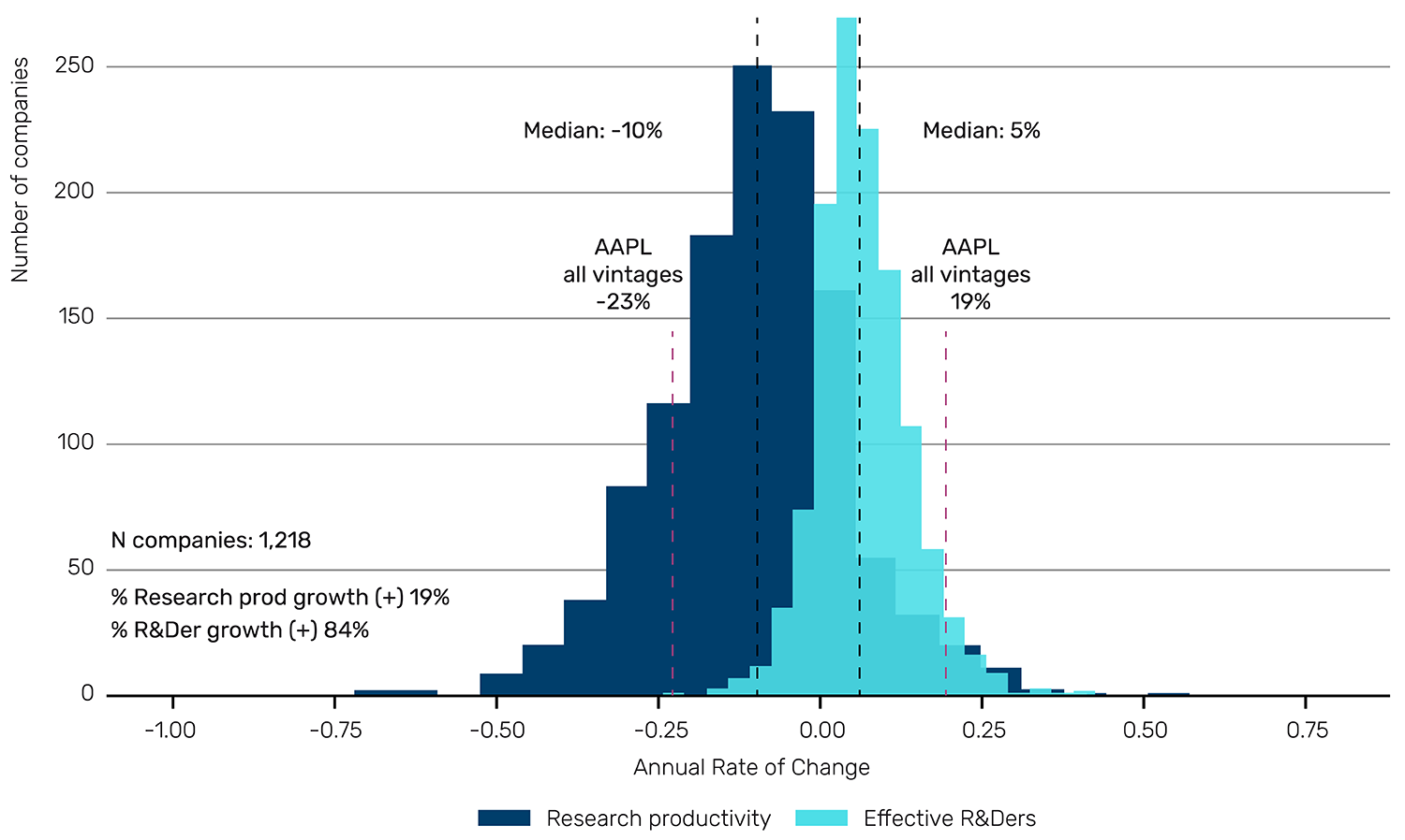 For reference, the data for Apple is labelled in both panels. Median research productivity growth was -10% with only 22% of the company vintages showing positive growth. Meanwhile, median growth in R&Ders was +6% with 86% of the company vintages showing positive growth. Results are similar for the company aggregated data in the bottom panel.