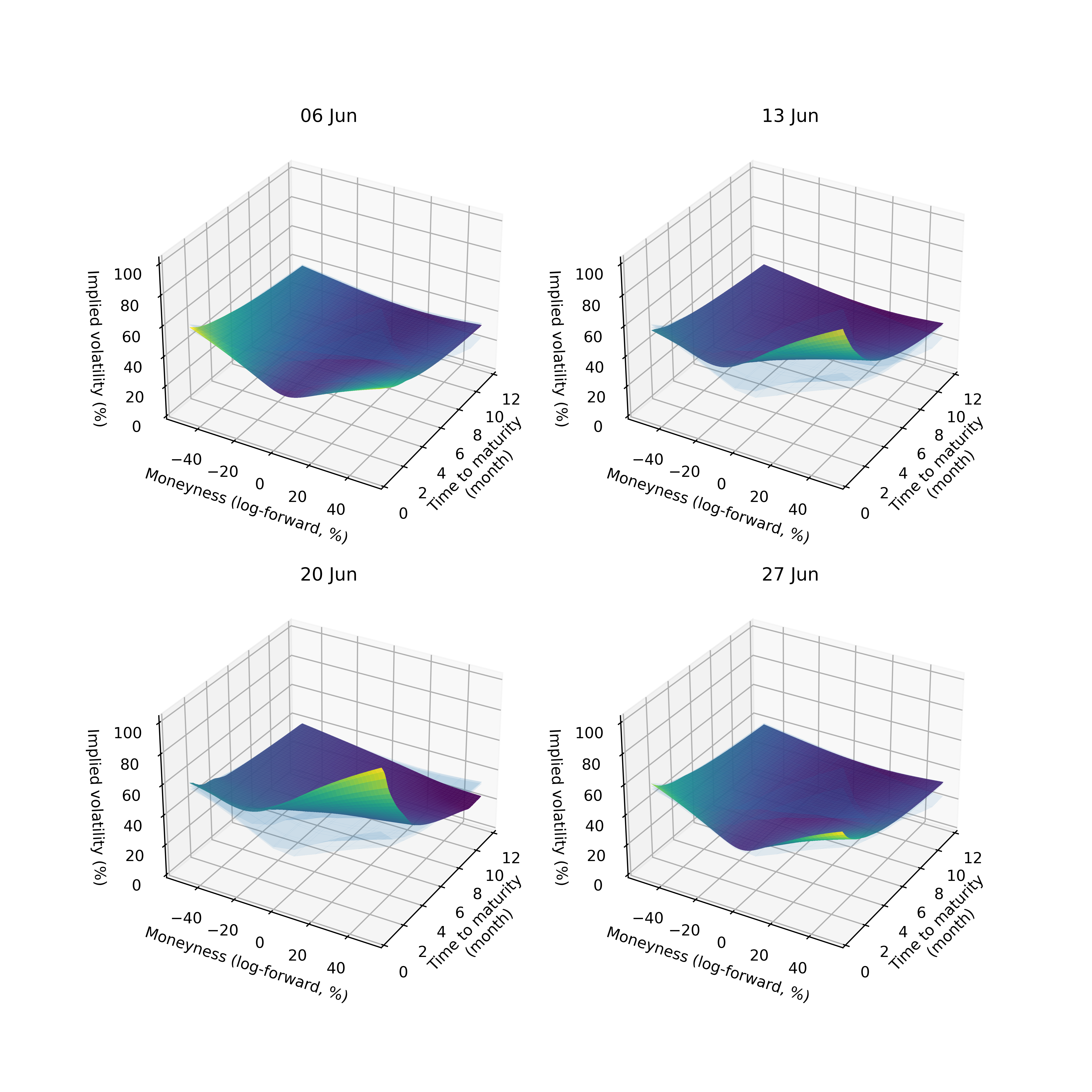 On 6 June, both cross-sections exhibited curve shapes consistent with normal trading periods. The skew curve displays a smile shape (assets subject to shocks in both directions are more akin to “smiles” than “smirks”) and the term structure is upward-sloping at the front of the curve.