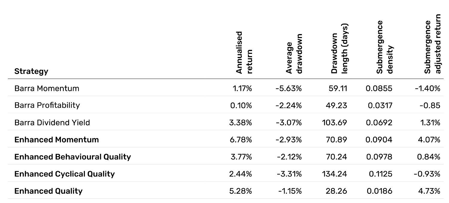 When adjusting for the relative time spent under water, submergence-adjusted returns provide a clearer view of strategy ranking. Under this framework, the benefits of Barra momentum and Cyclical Quality become less favourable. That said, while these signals may be less effective on their own, they can still add value when combined with other metrics to create a holistic view of quality companies.